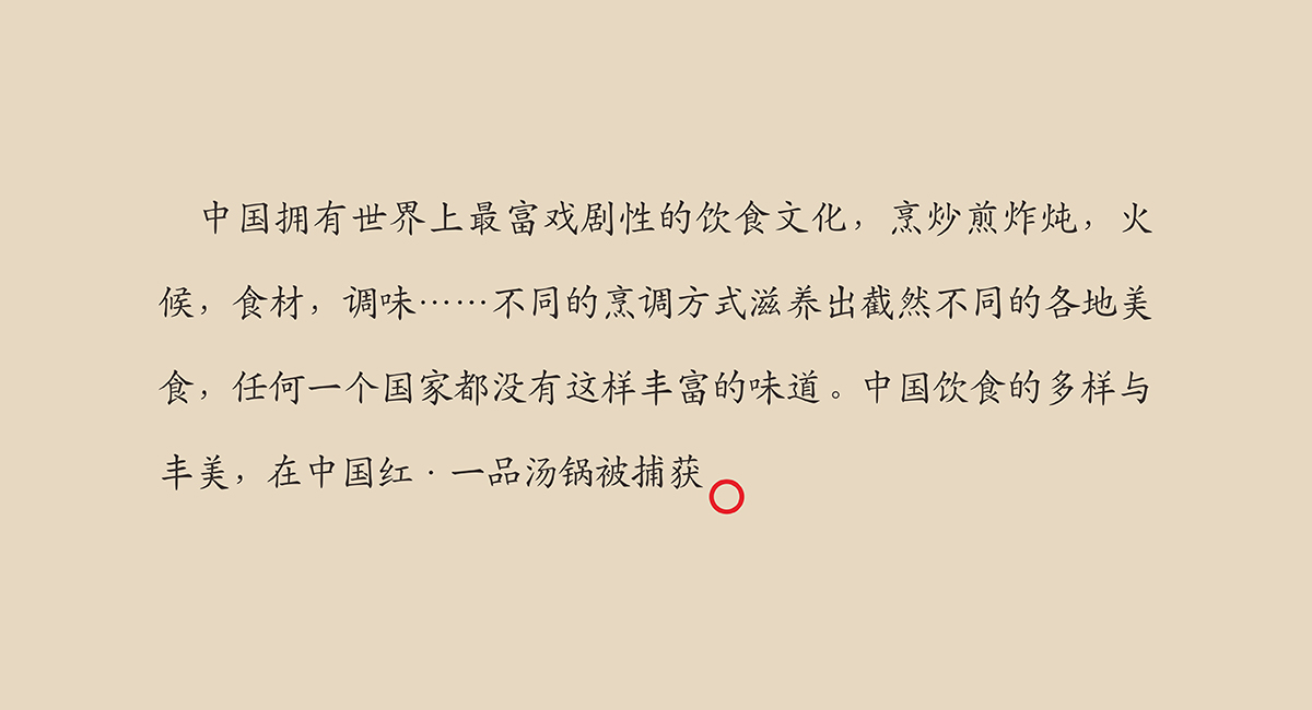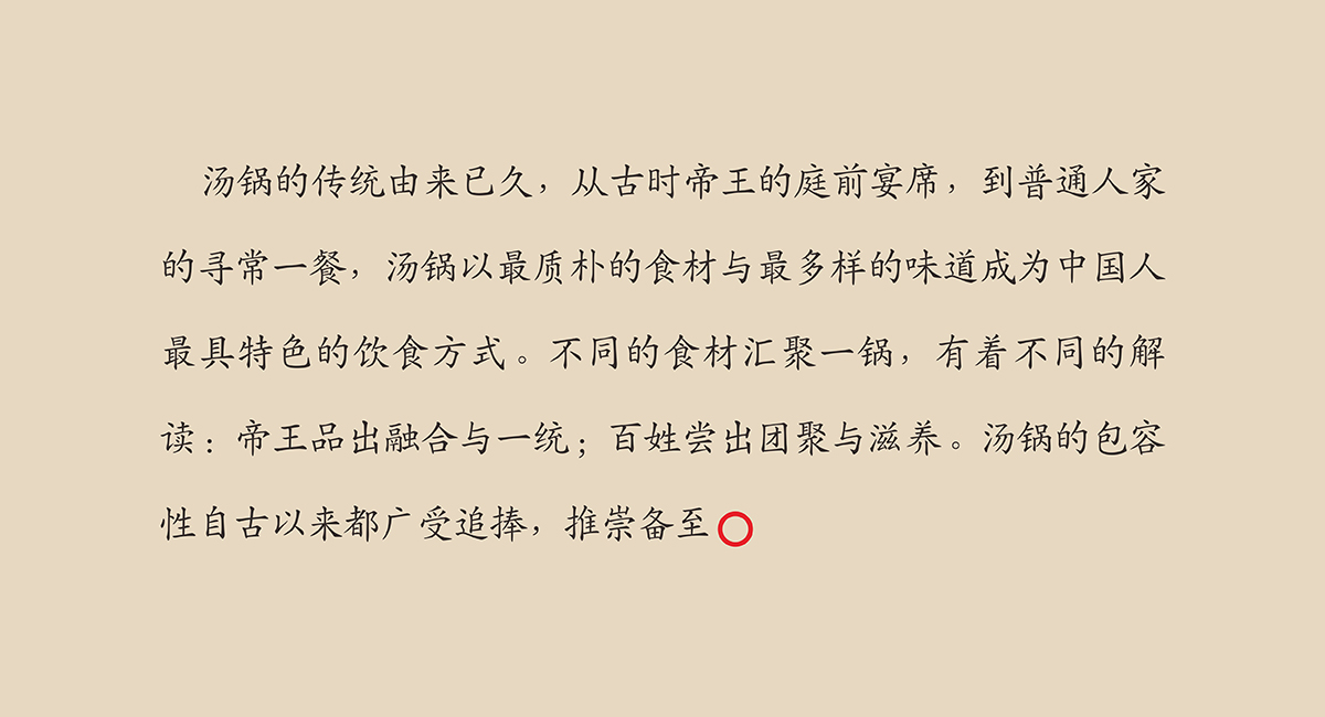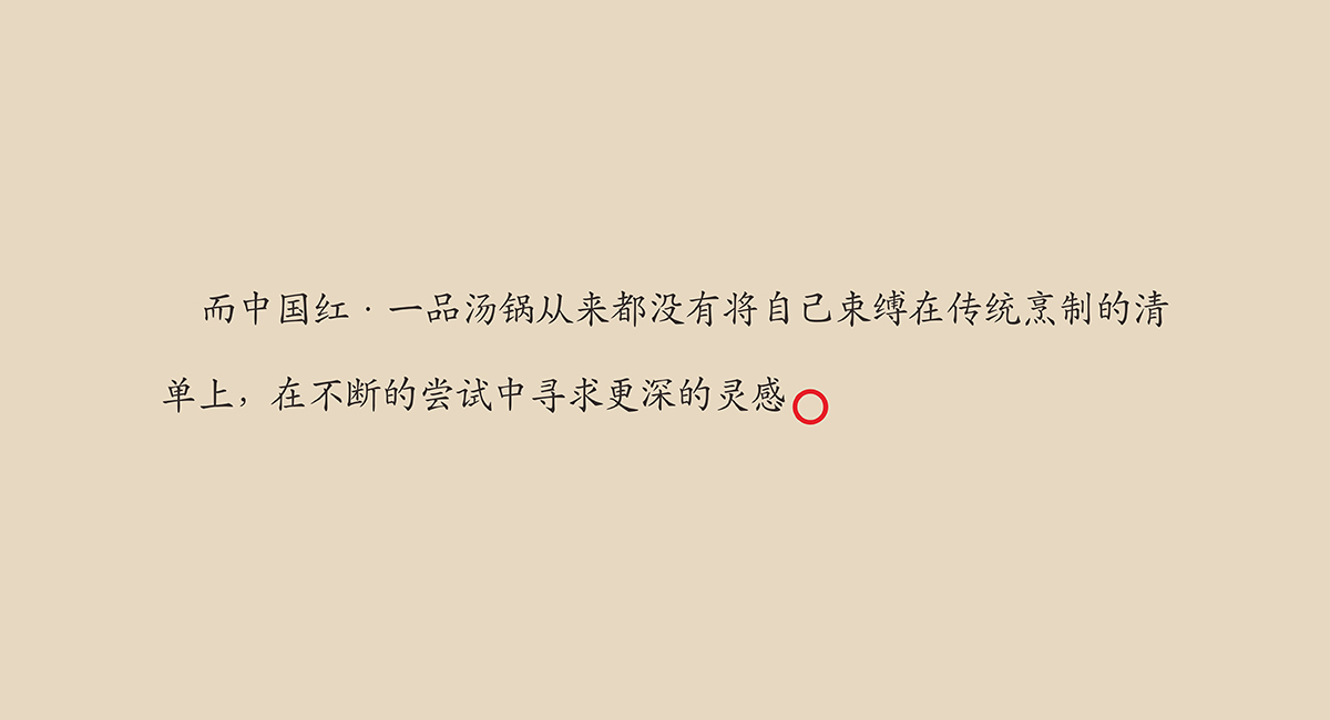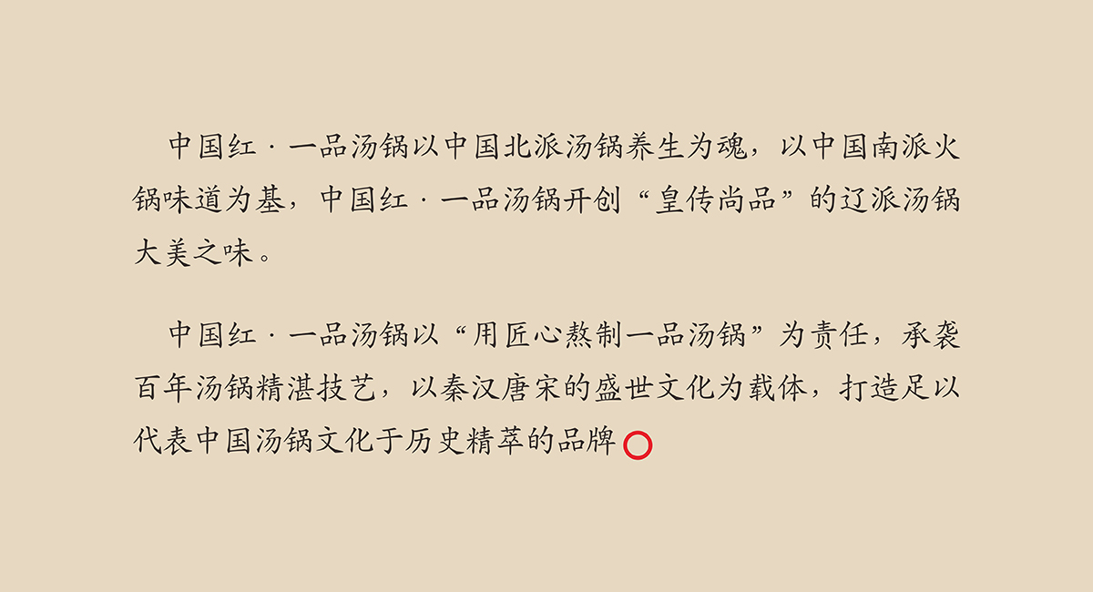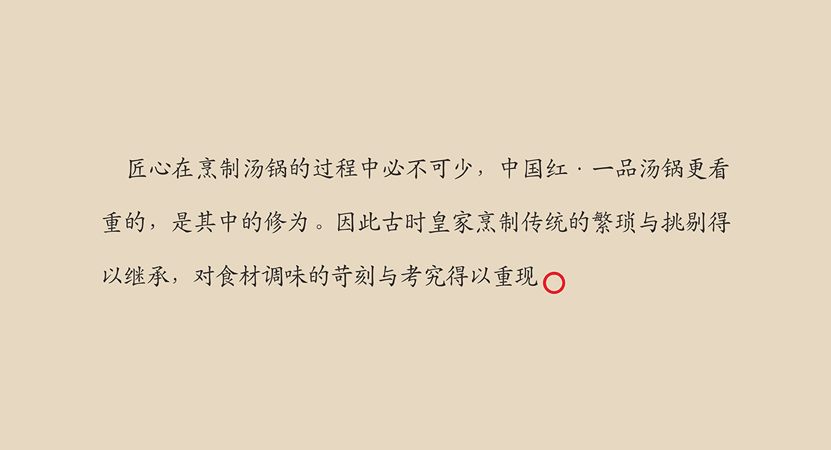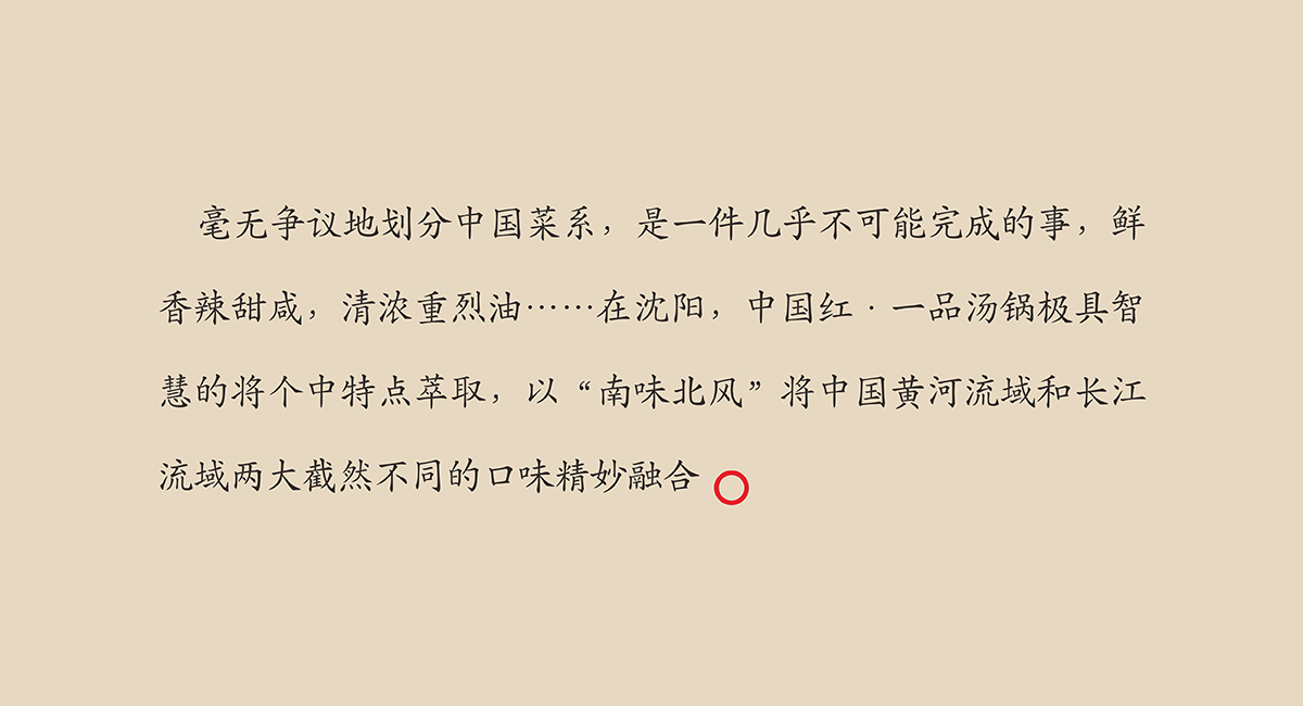 中國紅·一品湯鍋是沈陽中國紅餐飲打造的高端湯鍋品牌。產品以中國北派湯鍋養(yǎng)生為魂,中國南派火鍋味道為基,中國紅·一品湯鍋開創(chuàng)“皇傳尚品”的遼派湯鍋大美之味。成都九一堂商業(yè)空間設計用文化提升消費體驗, 中國紅·一品湯鍋以“用匠心熬制一品湯鍋”為責任,承襲百年湯鍋精湛技藝,以秦漢唐宋的盛世文化為載體,打造足以代表中國湯鍋文化于歷史精萃的品牌。 中國擁有世界上最富戲劇性的飲食文化,烹炒煎炸燉,火候,食材,調味……不同的烹調方式滋養(yǎng)出截然不同的各地美食,任何一個國家都沒有這樣豐富的味道。中國飲食的多樣與豐美,在中國紅·一品湯鍋被捕獲。 湯鍋的傳統(tǒng)由來已久,從古時帝王的庭前宴席,到普通人家的尋常一餐,湯鍋以最質樸的食材與最多樣的味道成為中國人最具特色的飲食方式。不同的食材匯聚一鍋,有著不同的解讀:帝王品出融合與一統(tǒng);百姓嘗出團聚與滋養(yǎng)。湯鍋的包容性自古以來都廣受追捧,推崇備至。 而中國紅·一品湯鍋從來都沒有將自己束縛在傳統(tǒng)烹制的清單上,在不斷的嘗試中尋求更深的靈感。毫無爭議地劃分中國菜系,是一件幾乎不可能完成的事,鮮香辣甜咸,清濃重烈油……在沈陽,中國紅·一品湯鍋極具智慧的將個中特點萃取,以“南味北風”將中國黃河流域和長江流域兩大截然不同的口味精妙融合。匠心在烹制湯鍋的過程中必不可少,中國紅·一品湯鍋更看重的,則是其中的修為。因此古時皇家烹制傳統(tǒng)的繁瑣與挑剔得以繼承,對食材調味的苛刻與考究得以重現(xiàn)。每一味美食都是一種禮儀,需要用虔誠才能代代相傳。中國人就是這樣,用食材與味道,將數(shù)千年歷史中的文化故事,沉淀于每一個普通人的餐桌前。當我們細品、探尋、理解、思考其中的味覺之美時,一代代中國人對飲食文化的責任與技藝飽含其中。九一堂商業(yè)空間設計將歷史美學與背景融入互動體驗空間設計中,中國紅·一品湯鍋,用中國最富戲劇性的美食,匯集自然饋贈的精華,用變幻不斷的味道,展現(xiàn)這個國家每一塊山林、湖泊、平原、海岸留存的天人合一。