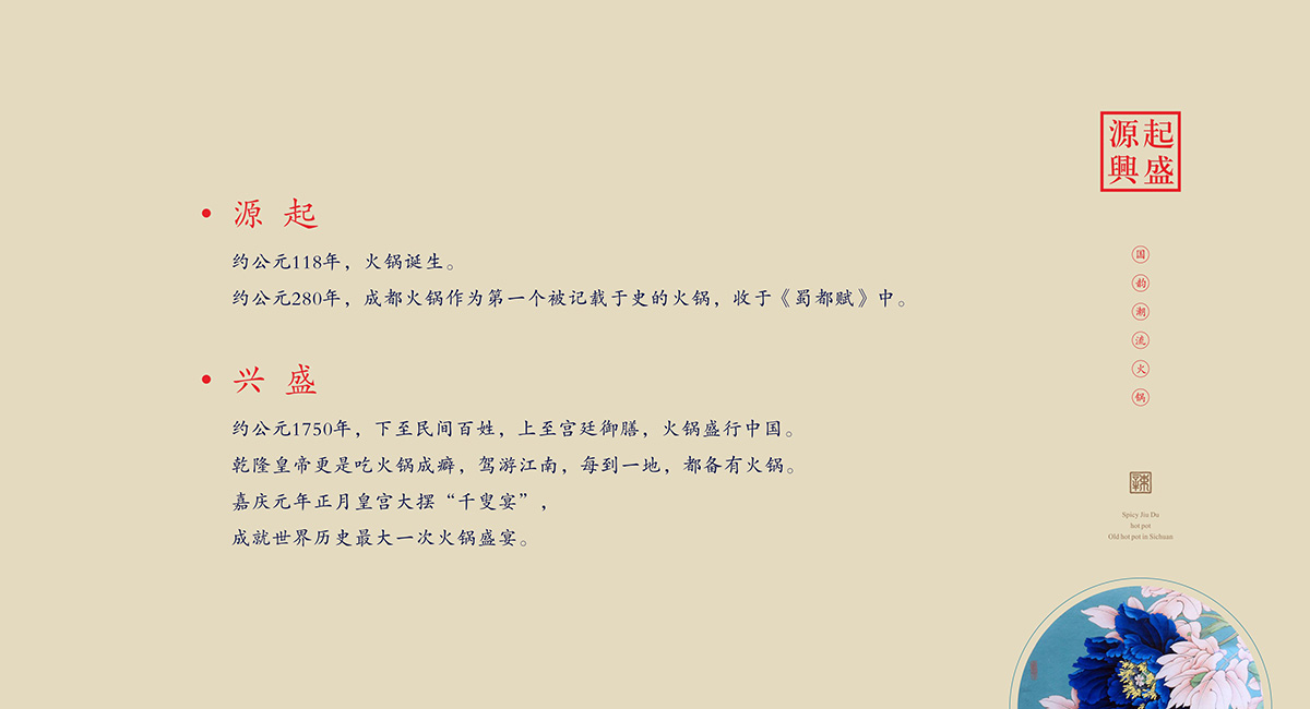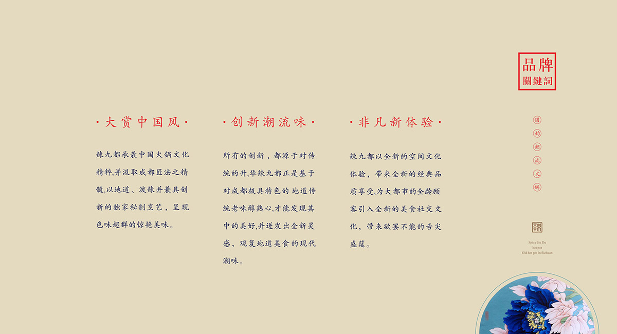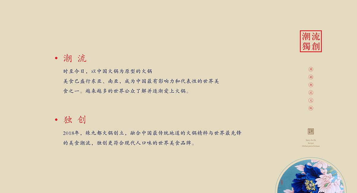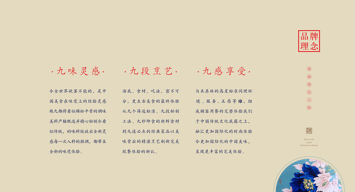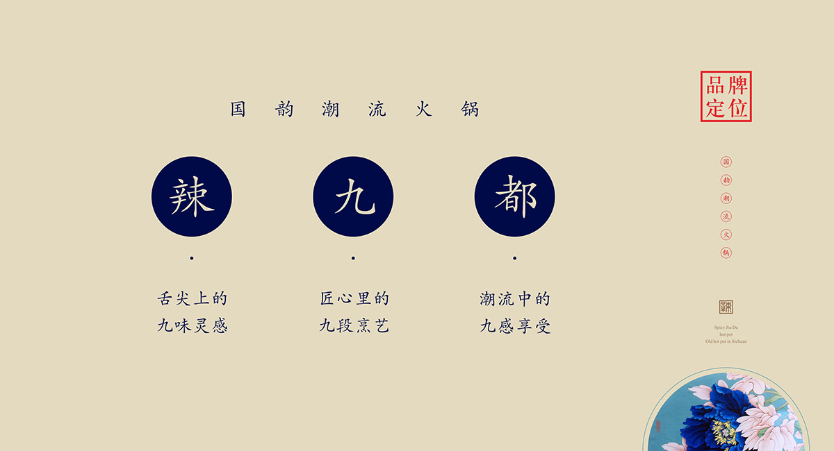約公元118年,火鍋誕生。公元280年,成都火鍋作為第一個被記載于史的火鍋,收于《蜀都賦》中。在火鍋盛行的今天,以火鍋為原型的火鍋美食已盛行東南亞,南非,成為中國最有影響力和代表性的世界美食之一。越來越多的各國美食愛好者也都愛上了中國火鍋。2018年,辣九都火鍋店正是啟動,融合中國最傳統地道的火鍋精髓與世界美食潮流,獨創出最符合現代人口味的世界美食餐飲品牌。火鍋店VI設計方面,是將中式傳統圖案與中國的書法藝術的一次完美演繹,將中國的古老傳承賦予了新的時尚氣息。把火辣的四川火鍋與皇室都城的高貴緊密相連,傳達出了辣九都火鍋店的熱情和高貴。