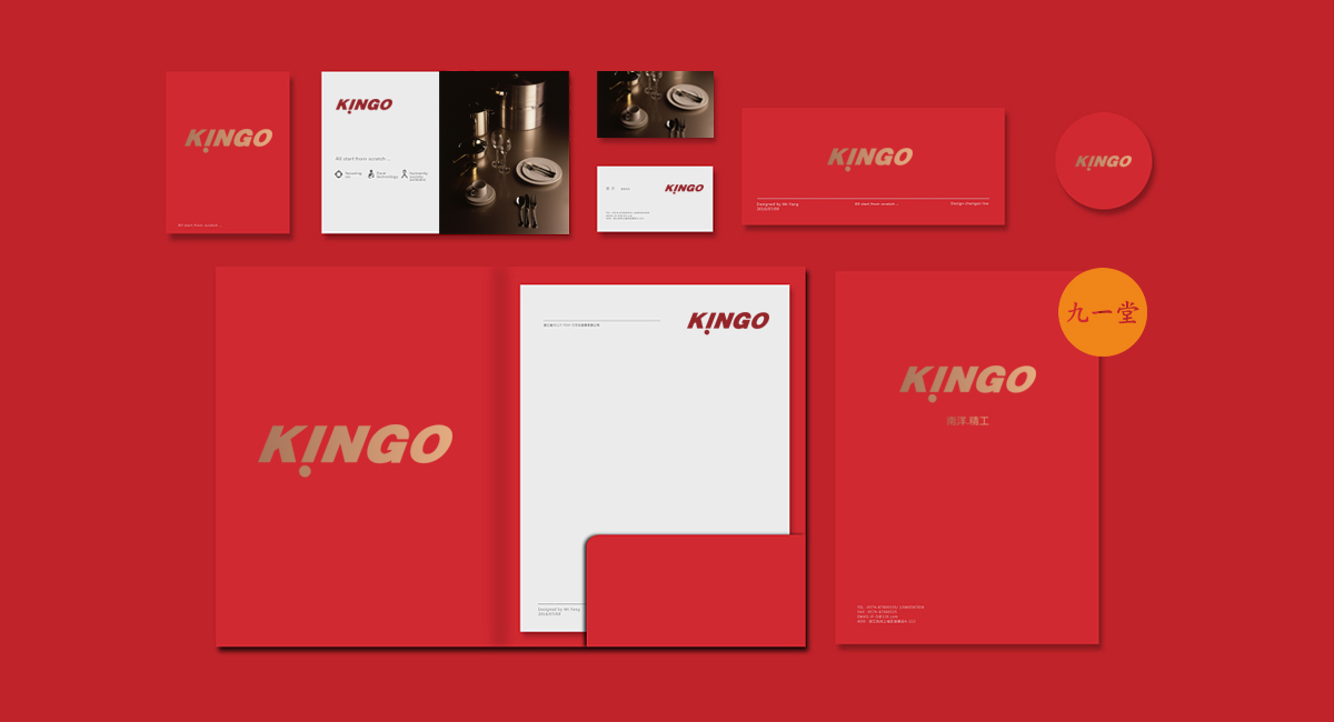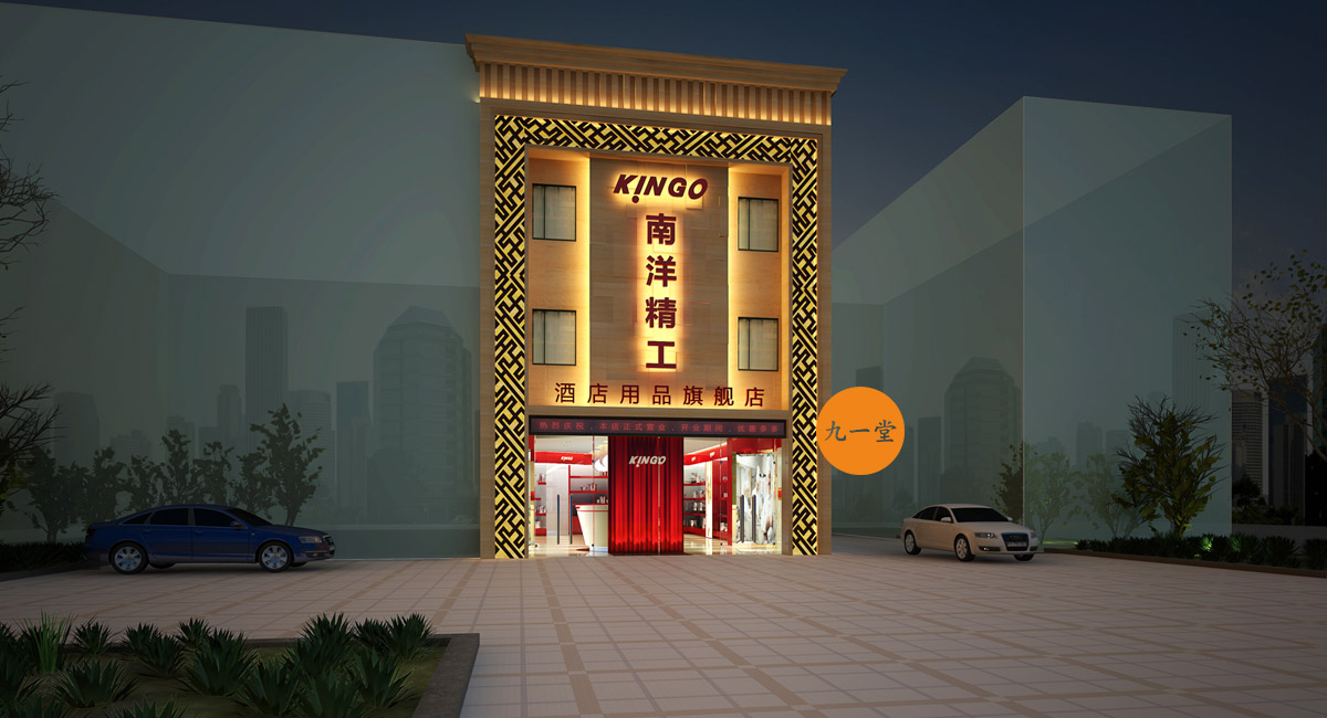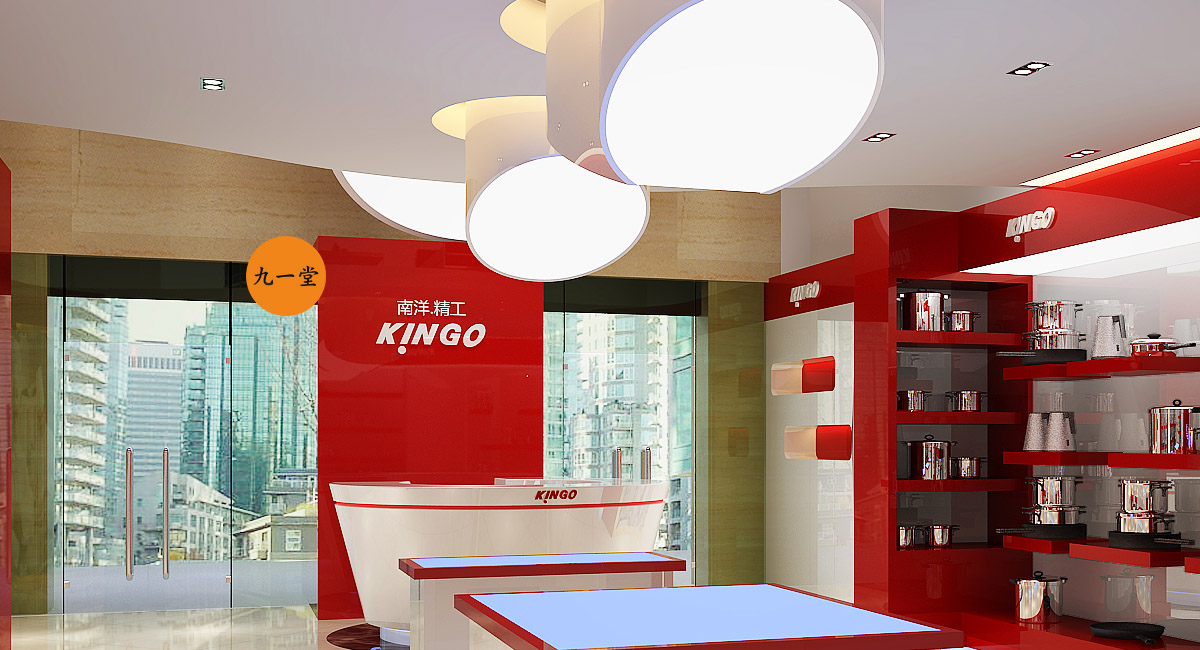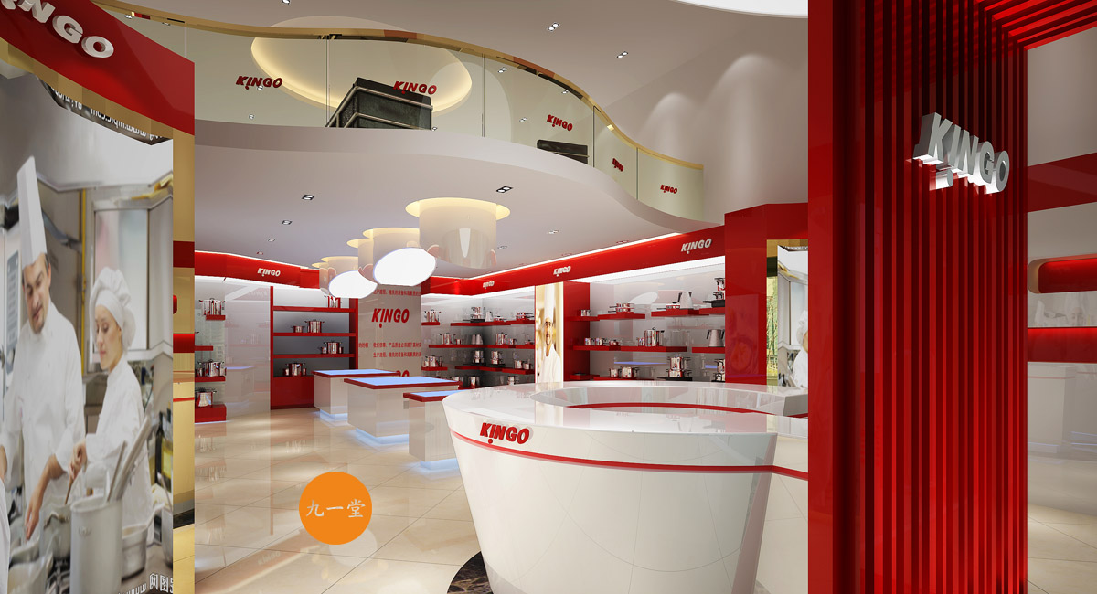 南洋精工是一家提供星級酒店設備用品的品牌公司,九一堂品牌設計對本案進行研究討論后,決定以提升整個品牌氣質為主,在色彩上加入流行色玫瑰金,把整個展廳的色彩比例調整為60%白色,35%紅色,5%金色。金色在整個品牌氣質里起到了畫龍點睛的作用。而在整個展廳設計中,為了更好展示不銹鋼材質,巧妙用了展柜發光以及對展柜下面使用氛圍燈光的手法,室內展柜材質則多用亮面烤漆來表現,增強與產品本色不銹鋼材質的對比,更好的突出產品特質。整個門頭則用米黃色石材,與星級酒店的大氣高品質做呼應,體現南洋精工的品牌核心價值。