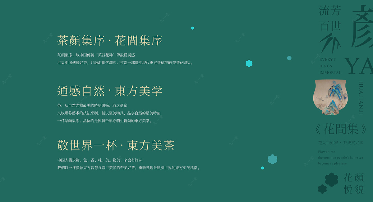 從倫敦瑞吉的下午茶,到塞納河左岸的茉莉茶,從京都潮街的摩登抹茶,到斯里蘭卡的風味茶,我們甄選來自世界各地的潮流新味,以東方美學,呈現獨一無二的世界美茶。九一堂此次設計打造的茶顏集序美學茶飲品牌,區別于傳統茶飲,提出美學茶品這一觀點,以東方美學呈現獨一無二的世界美茶,重新喚起茶飲品牌的東方至美風潮。